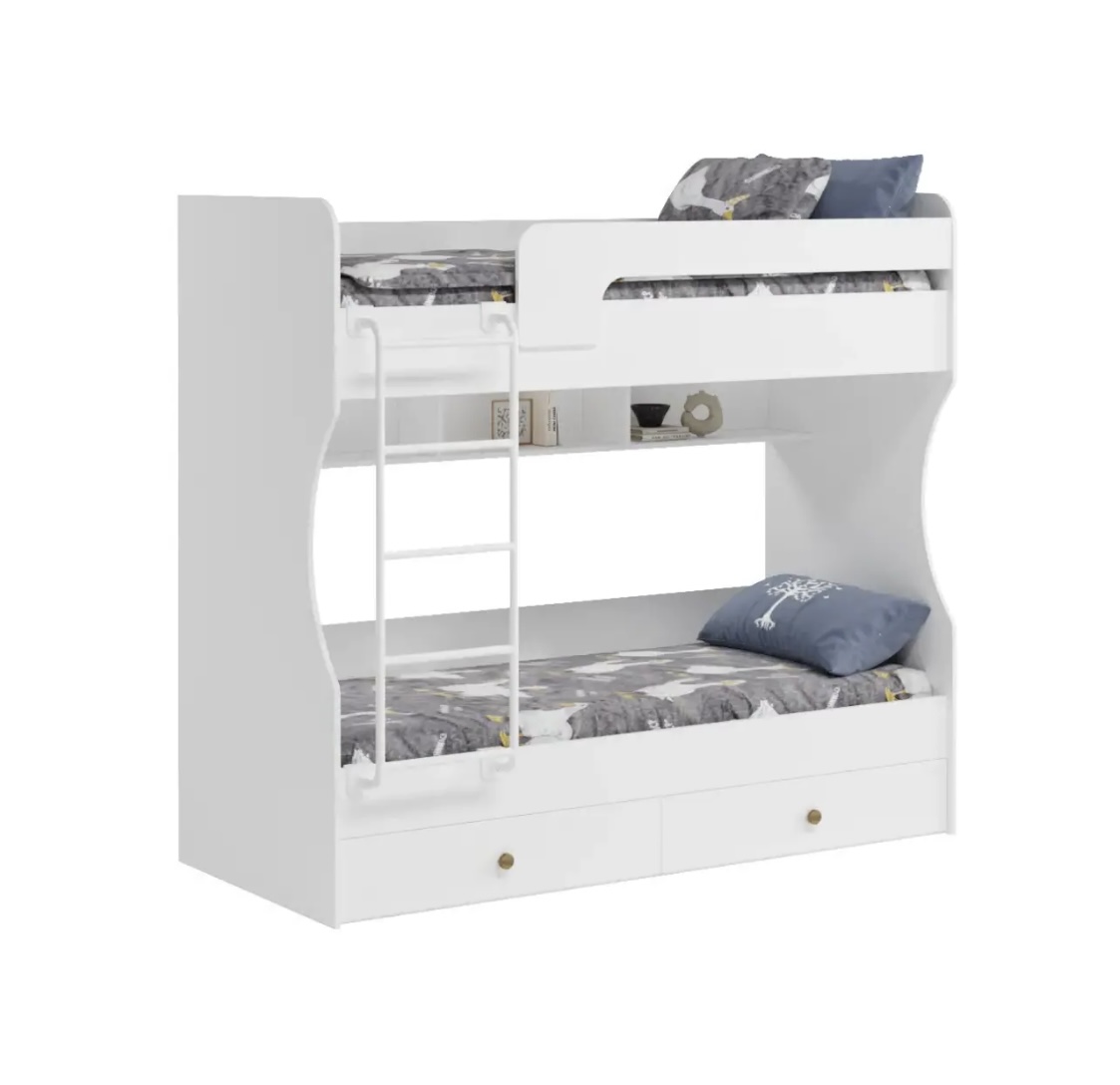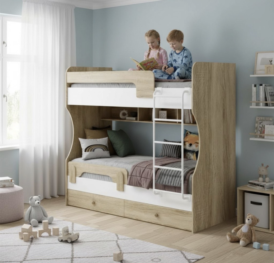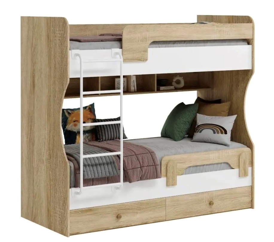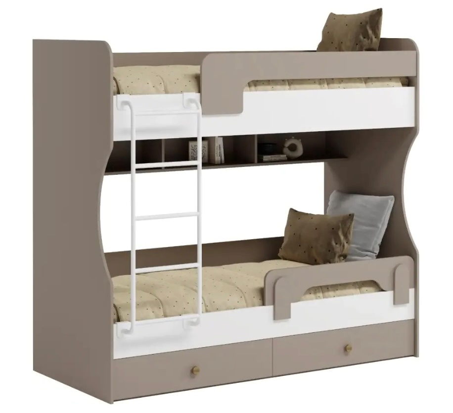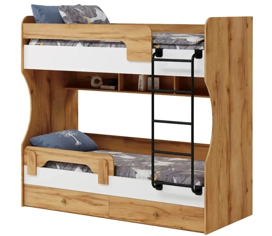 Двухъярусная кровать в декоре под дерево идеальна для любых интерьеров.