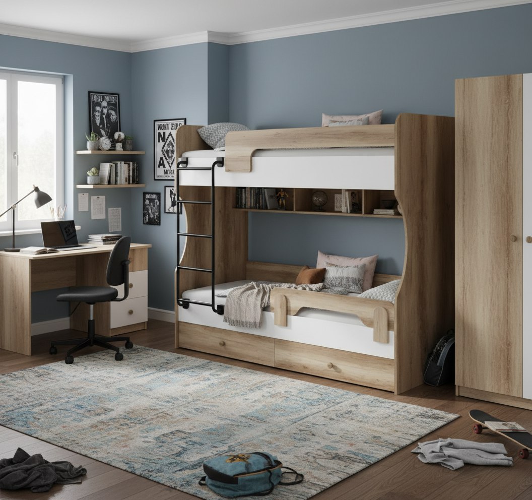 Двухъярусная кровать в декоре под дерево идеальна для любых интерьеров.