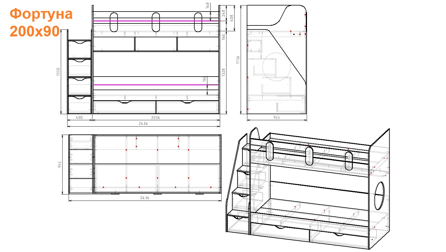 Габариты кровати с учетом лестницы: ширина 2436 х высота 1736 х глубина 955 мм