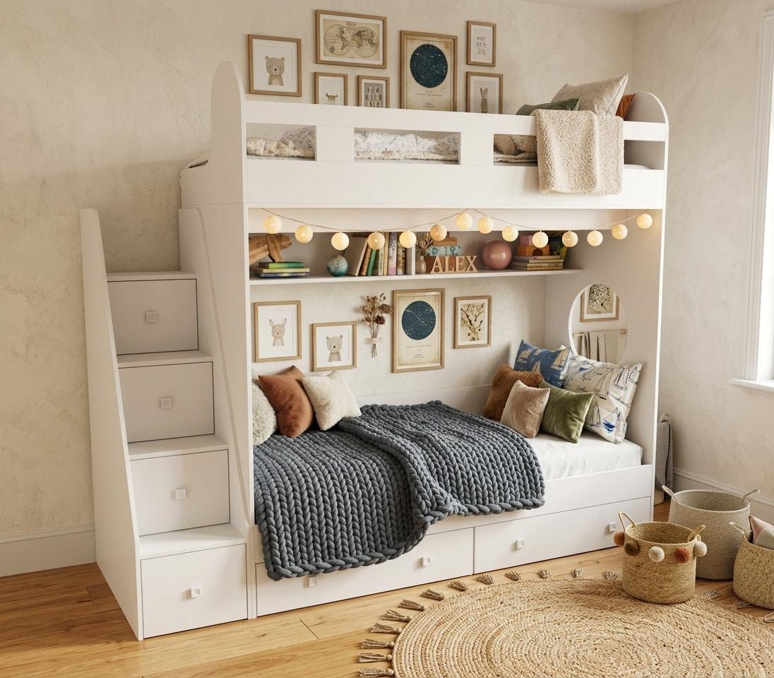 спальное место для двоих, навесная полка для книг и игрушек, вместительные выдвижные ящики под кроватью, а также безопасная лестница, обеспечивающая быстрый и удобный доступ на второй этаж.