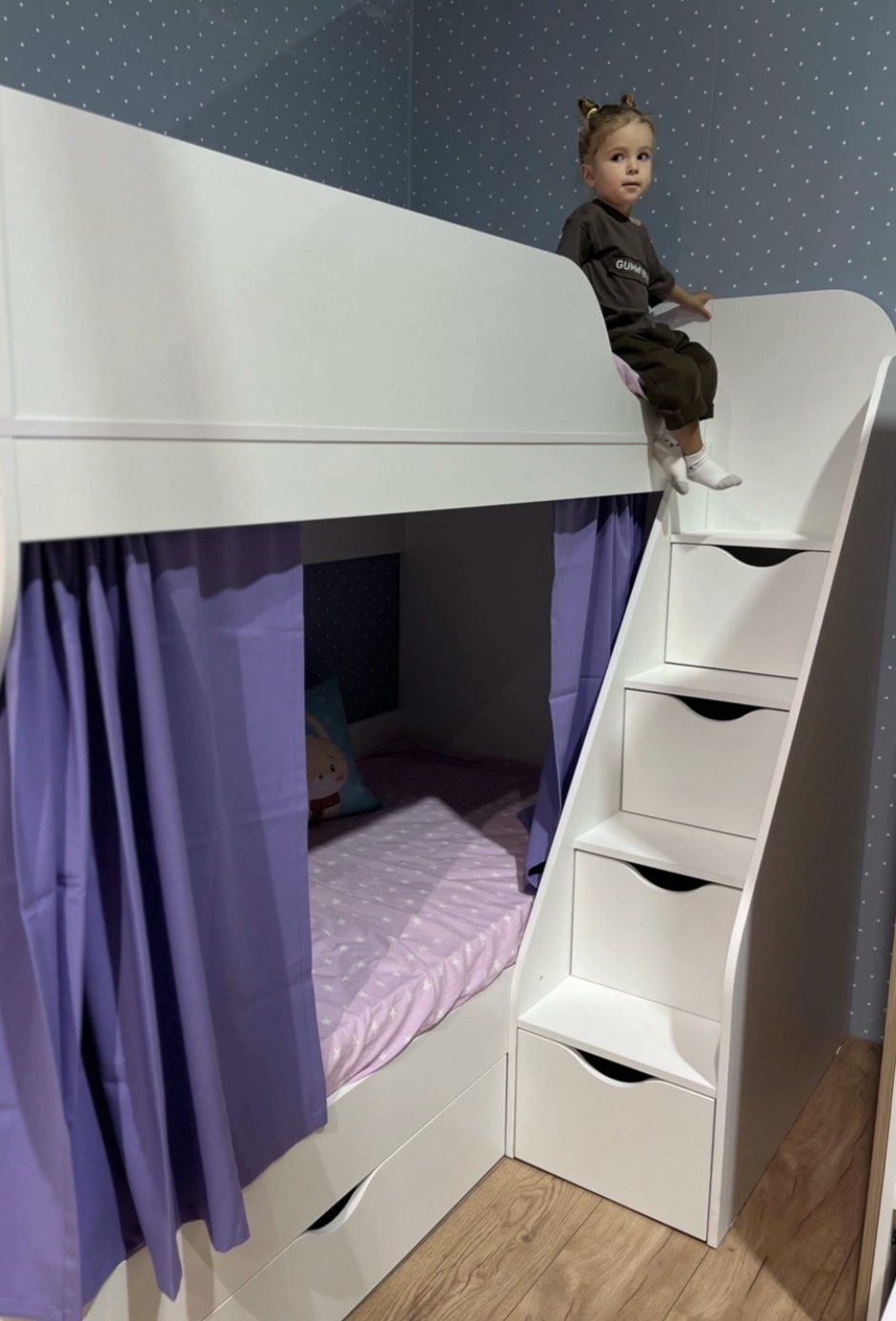 Преимущества данной модели - удобная, безопасная лестница с ящиками для игрушек и комфортная высота кровати.