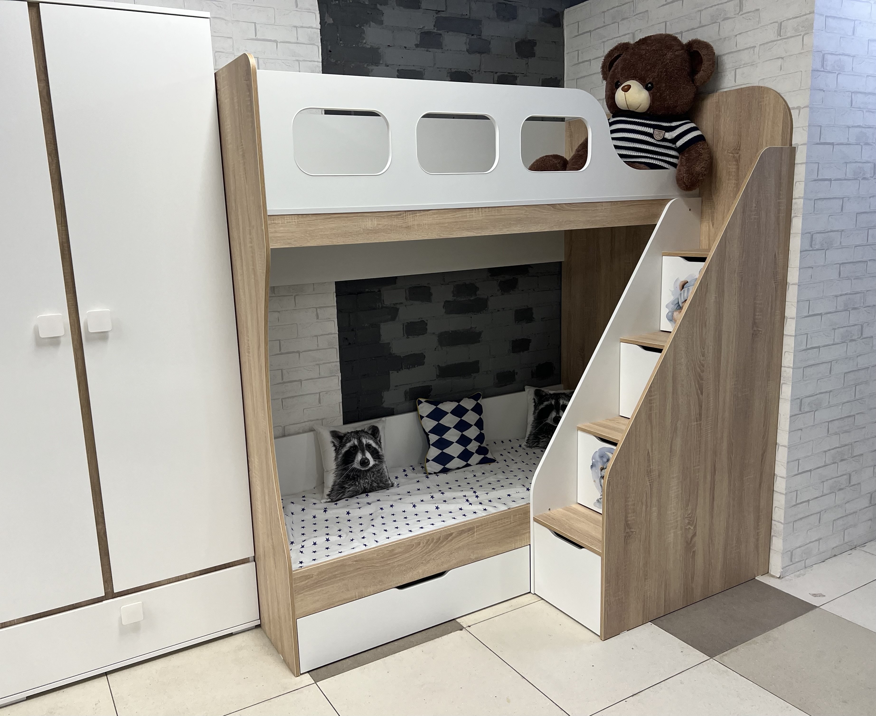 Высокая нагрузка на спальные места. Удобная лестница с ящиками. Высокий, безопасный бортк