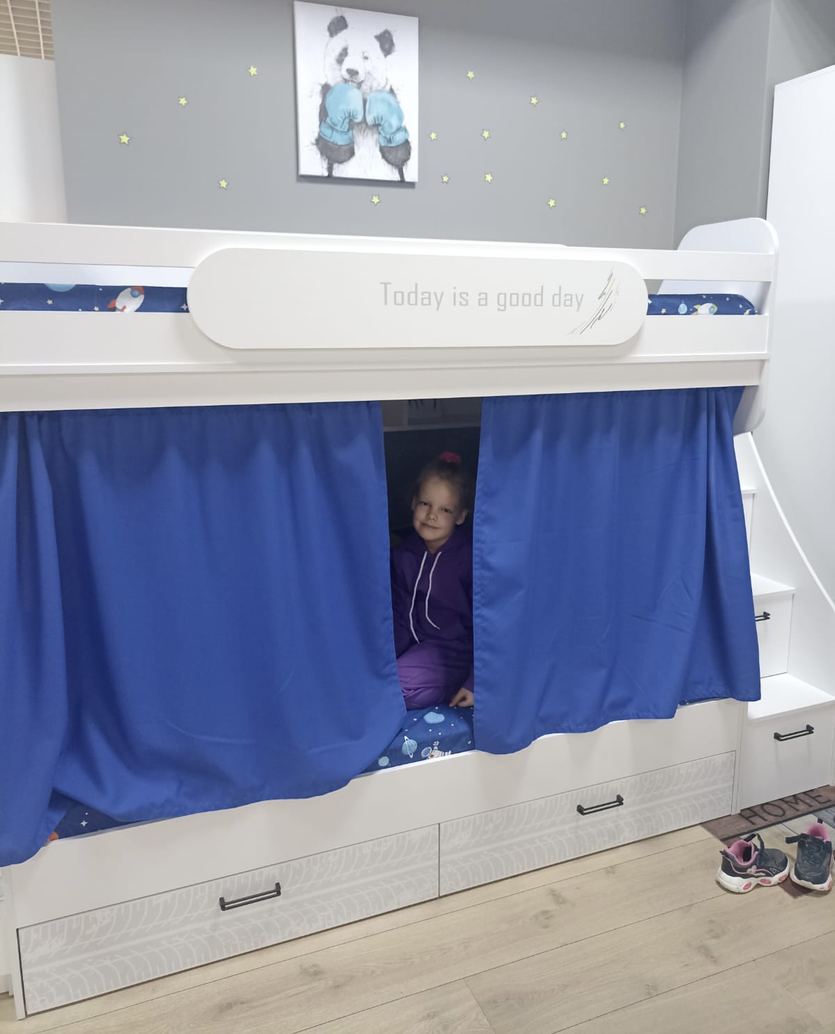 В лестницу встроены ящики для игрушек.