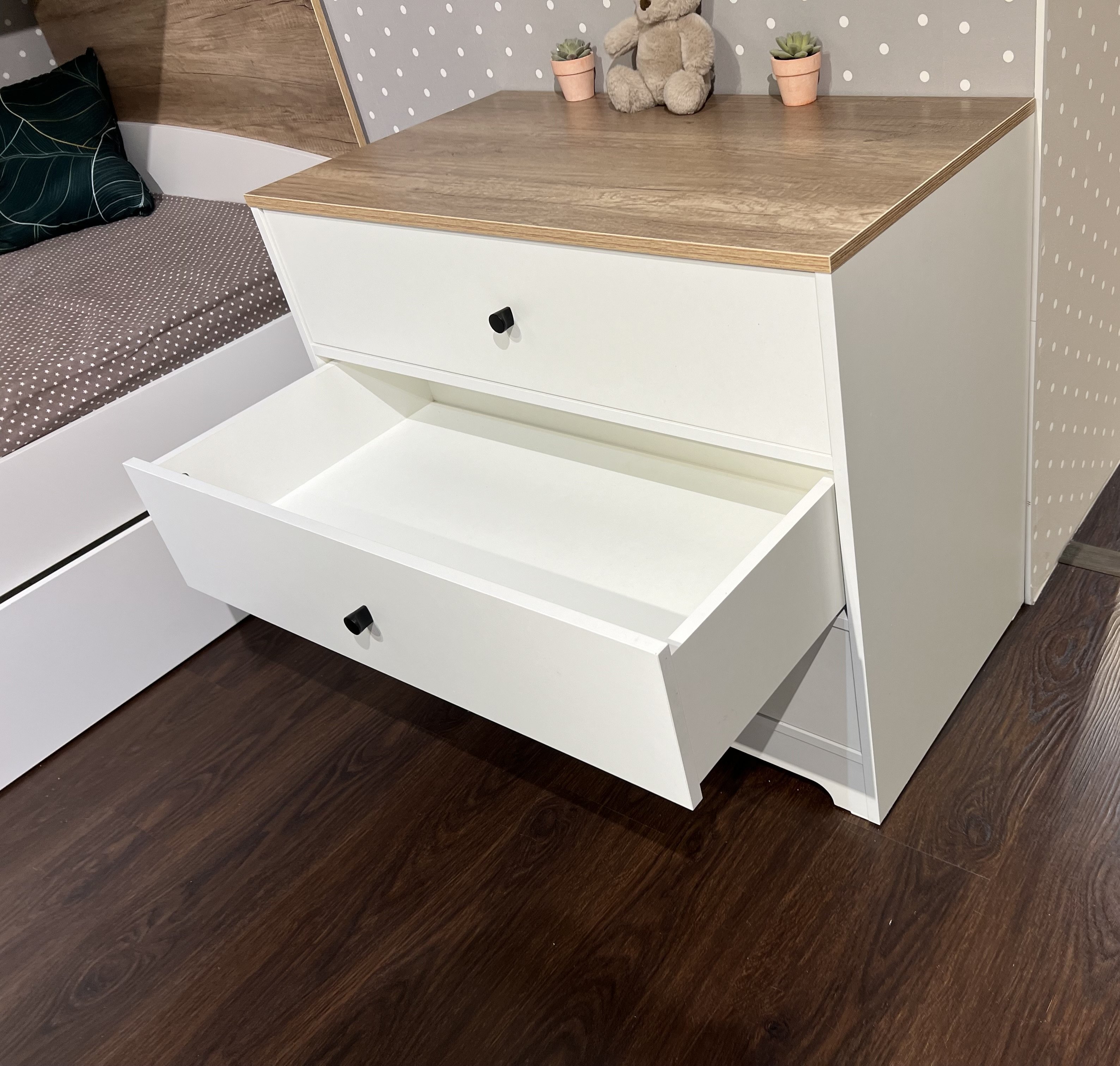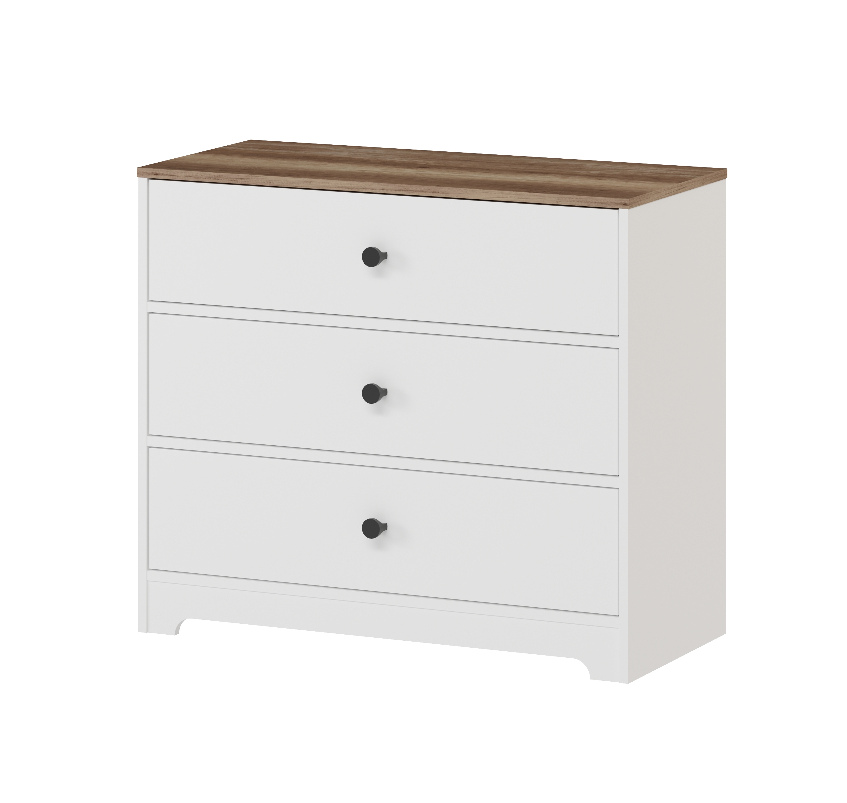 В комод встроены три выдвижных ящика на направляющих скрытого монтажа с ДОВОДЧИКАМИ.