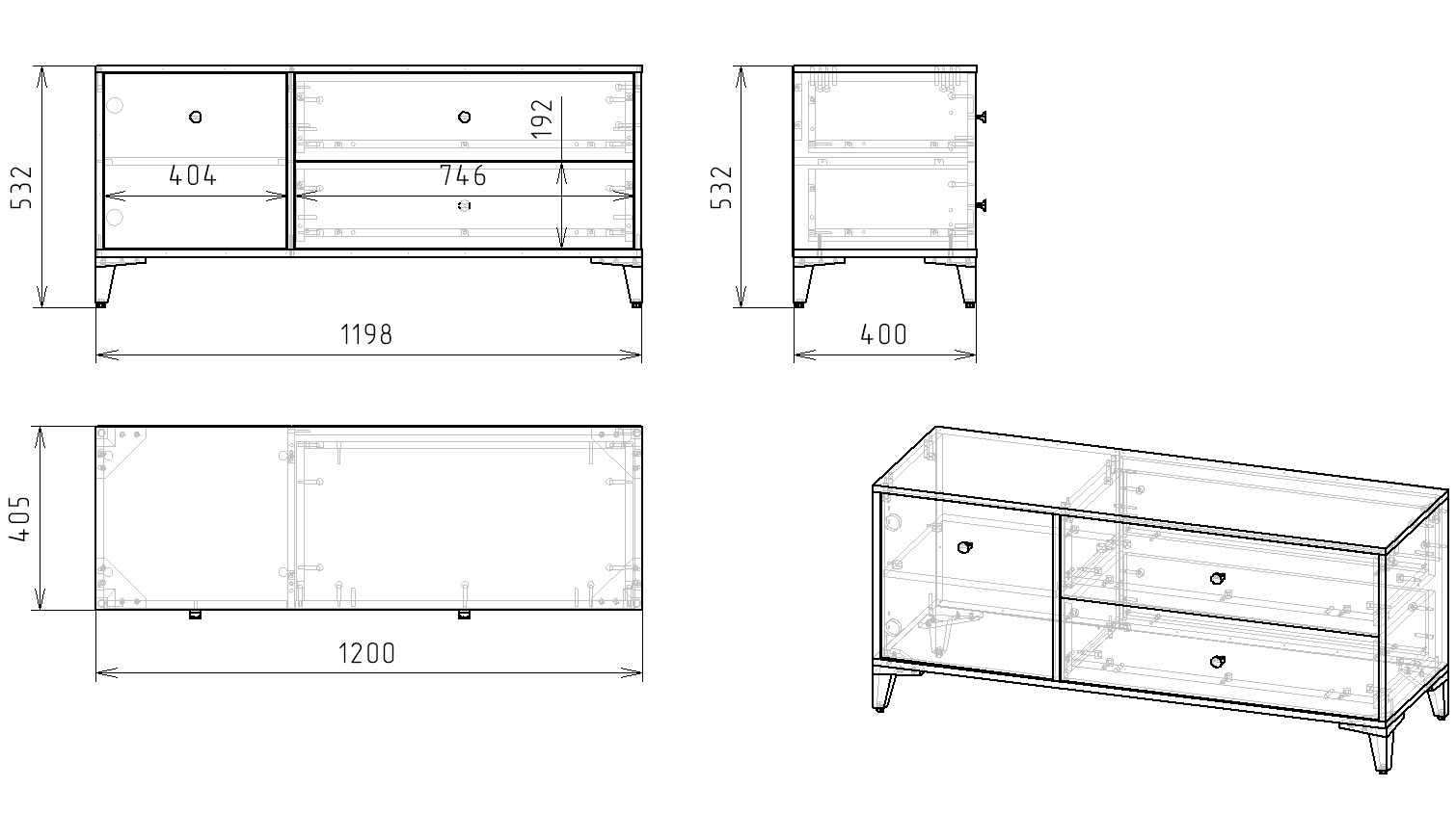 Габариты тумбы: ширина 1200, глубина 405, высота 532 мм
