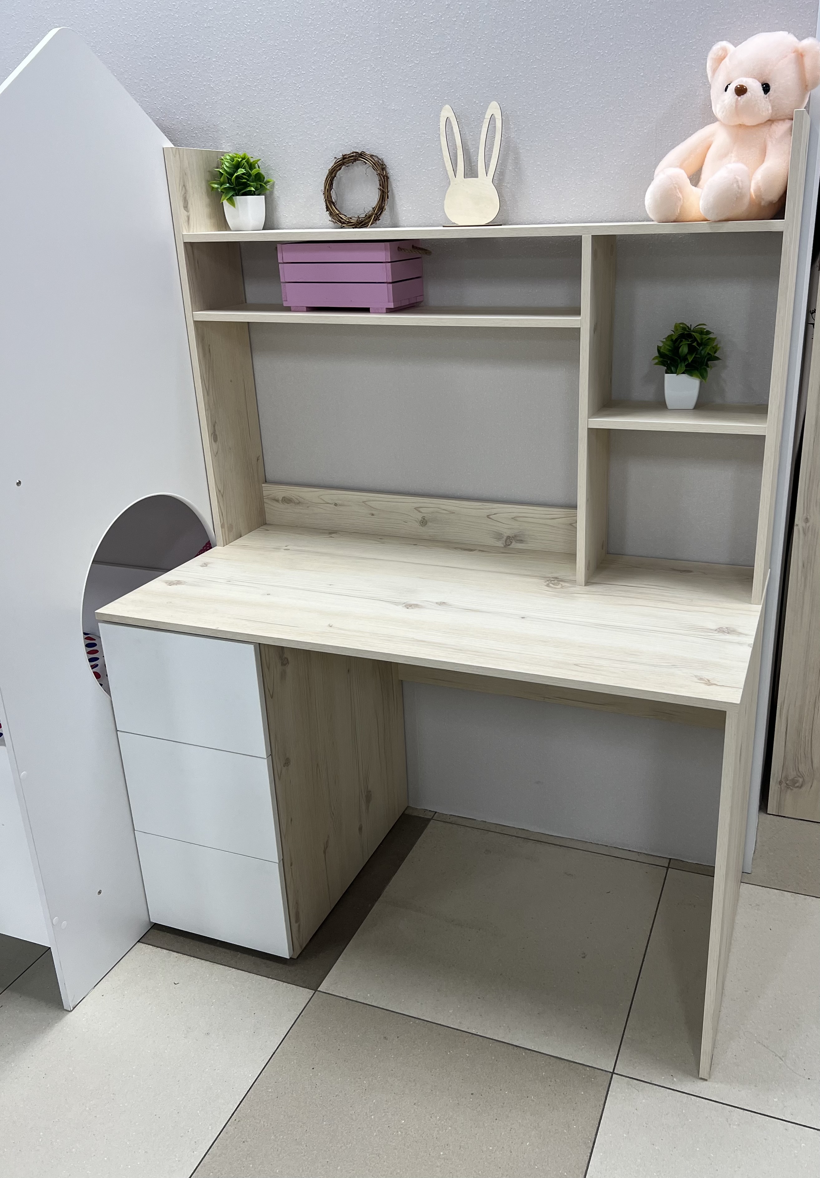 Практичный и удобный стол займет немного места в комнате и в тоже время позволит разместить учебники, любимые книги и игрушки.