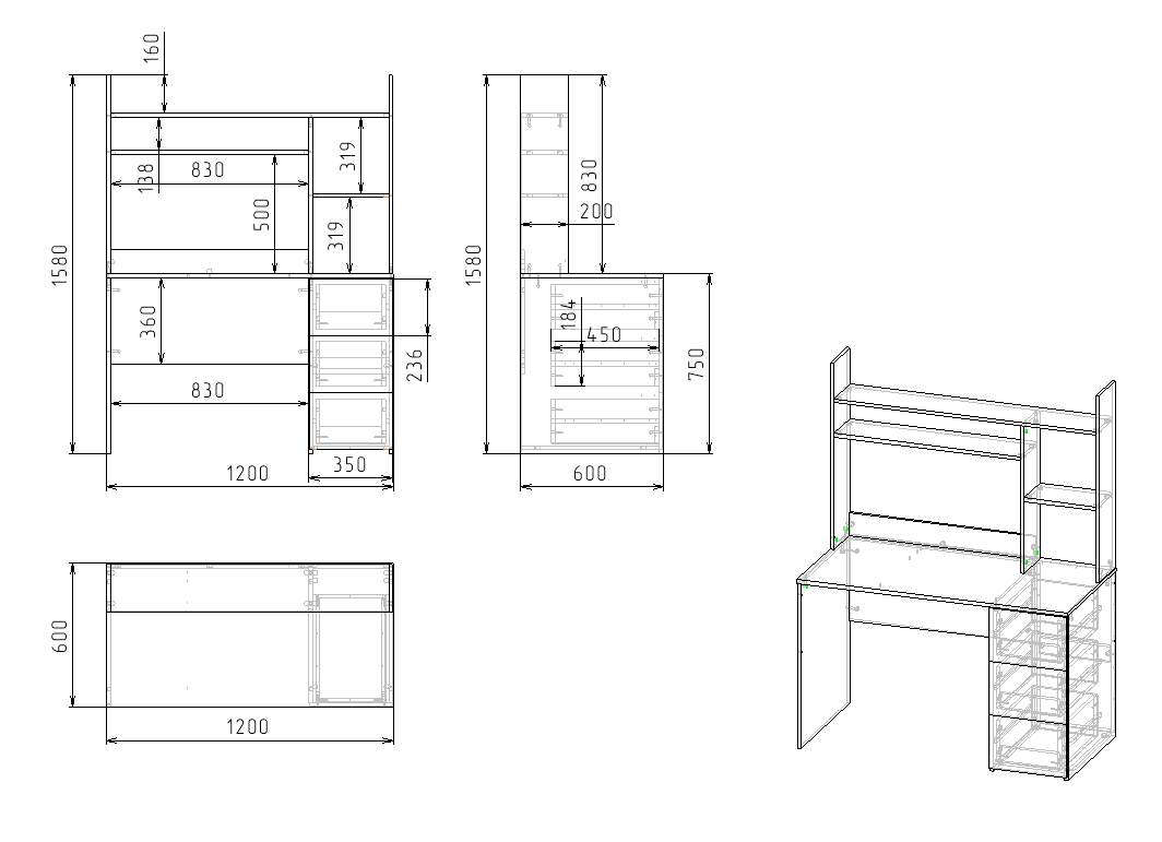Габариты стола: ширина 1200, глубина 600, высота 1580 мм