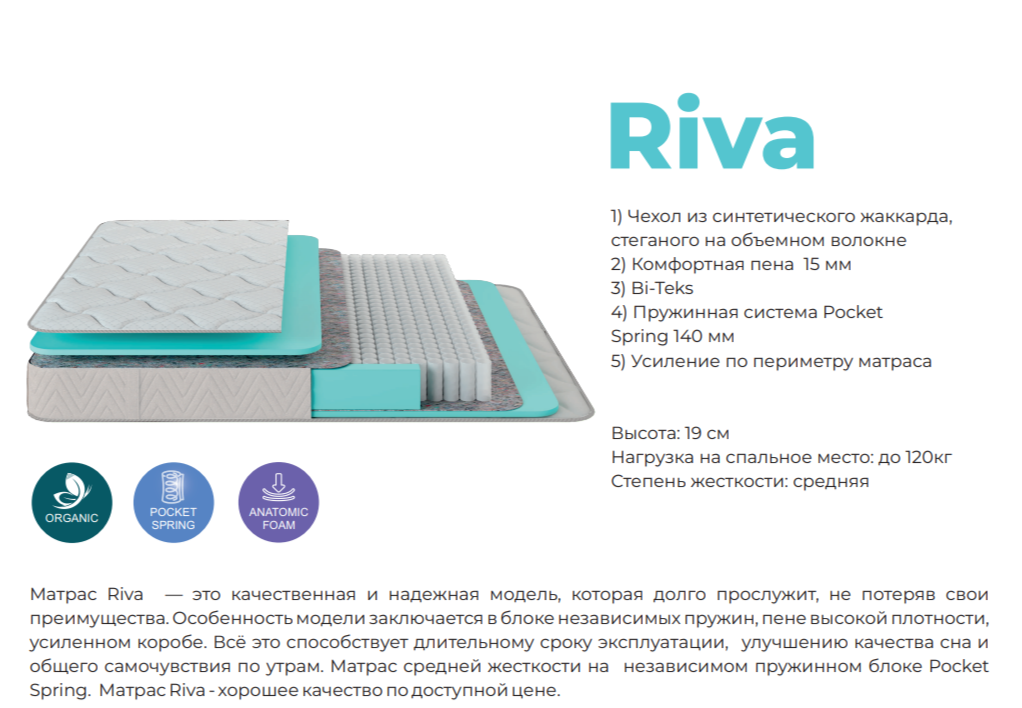 Матрас РИВА – это качественный и надежная модель, которая прослужит долго, не потеряв свои преимущества.