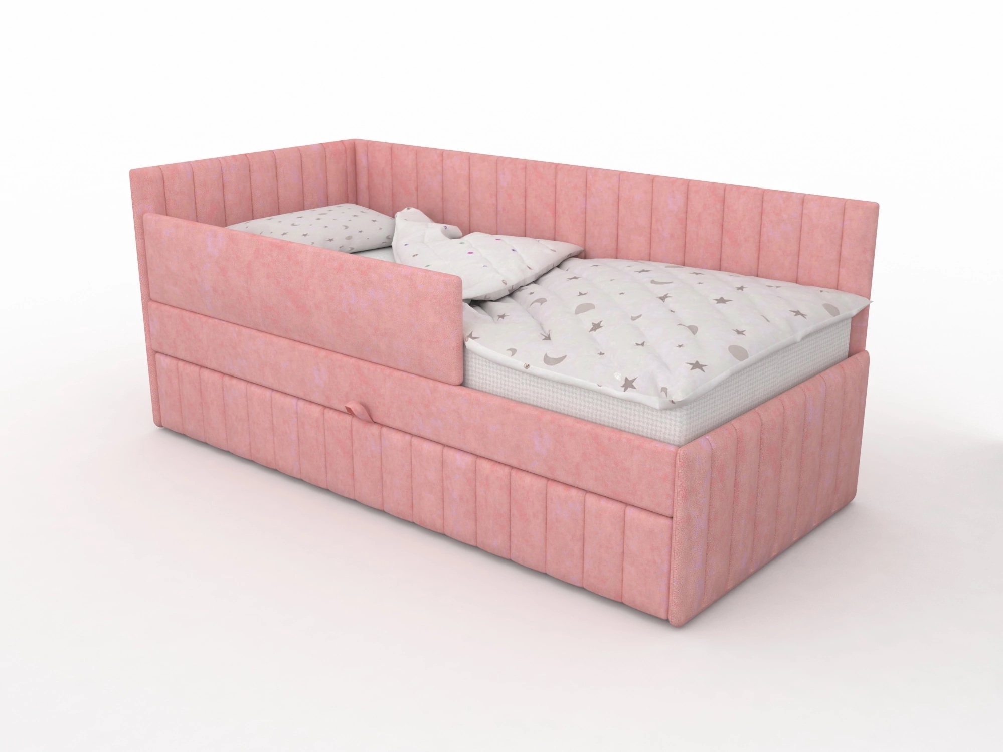 Кровать полностью безопасна для ребенка, так как имеет прочную конструкцию и мягкие подлокотники, которые защитят ребенка от травм.