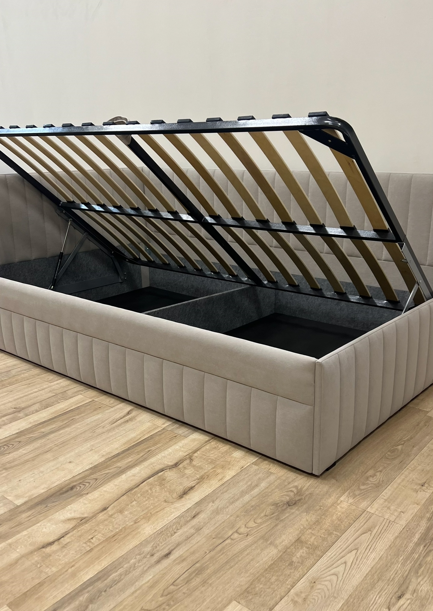 Представленная модель кровати оснащена подъемным механизмом.