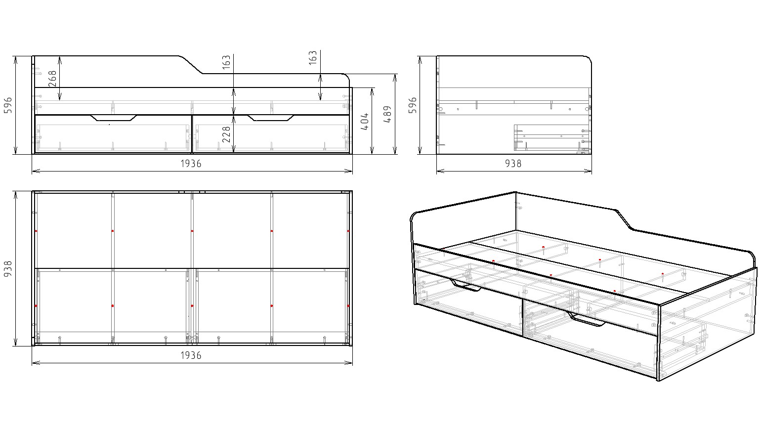Габариты кровати: ширина 1936, глубина 938, высота 596 мм