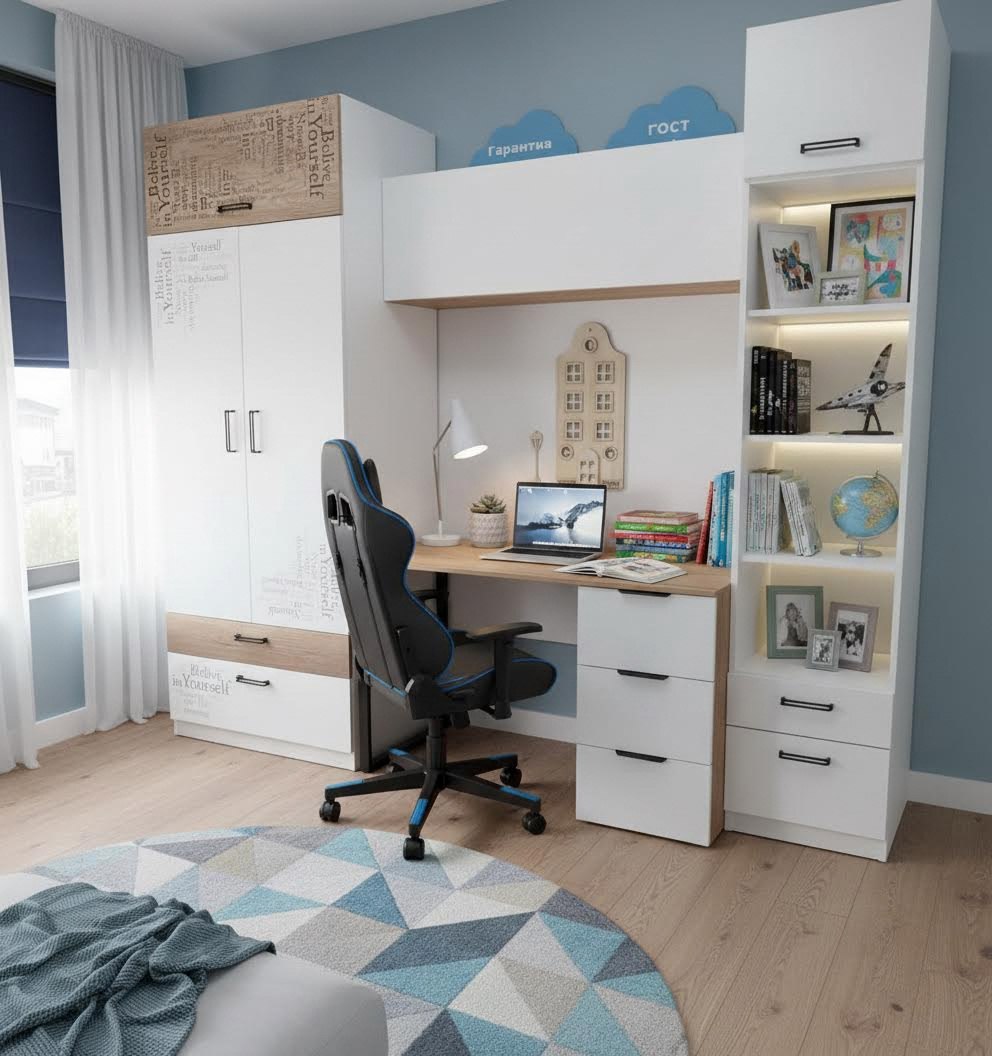Идеально вписывается в детскую комнату, шкаф очень практичный и вместительный, по своим габаритам отлично подходит и для небольших комнат.