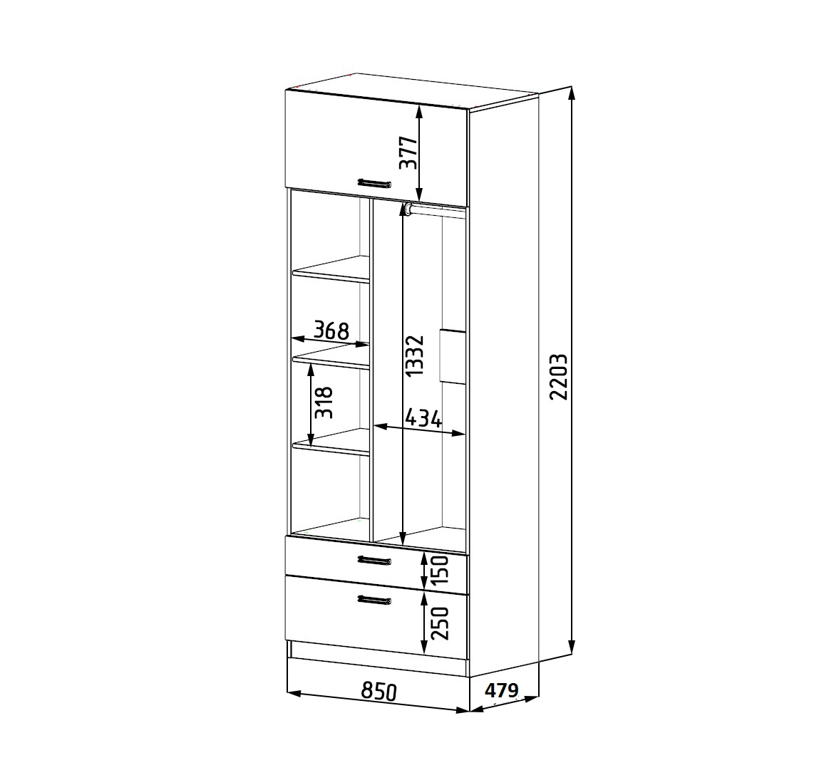 Габариты шкафа: ширина 850 х высота 2203 х глубина 479 мм