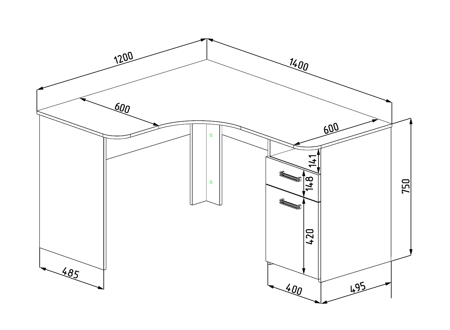 Габариты стола: ширина 1400 х высота 750 х глубина 1200 мм