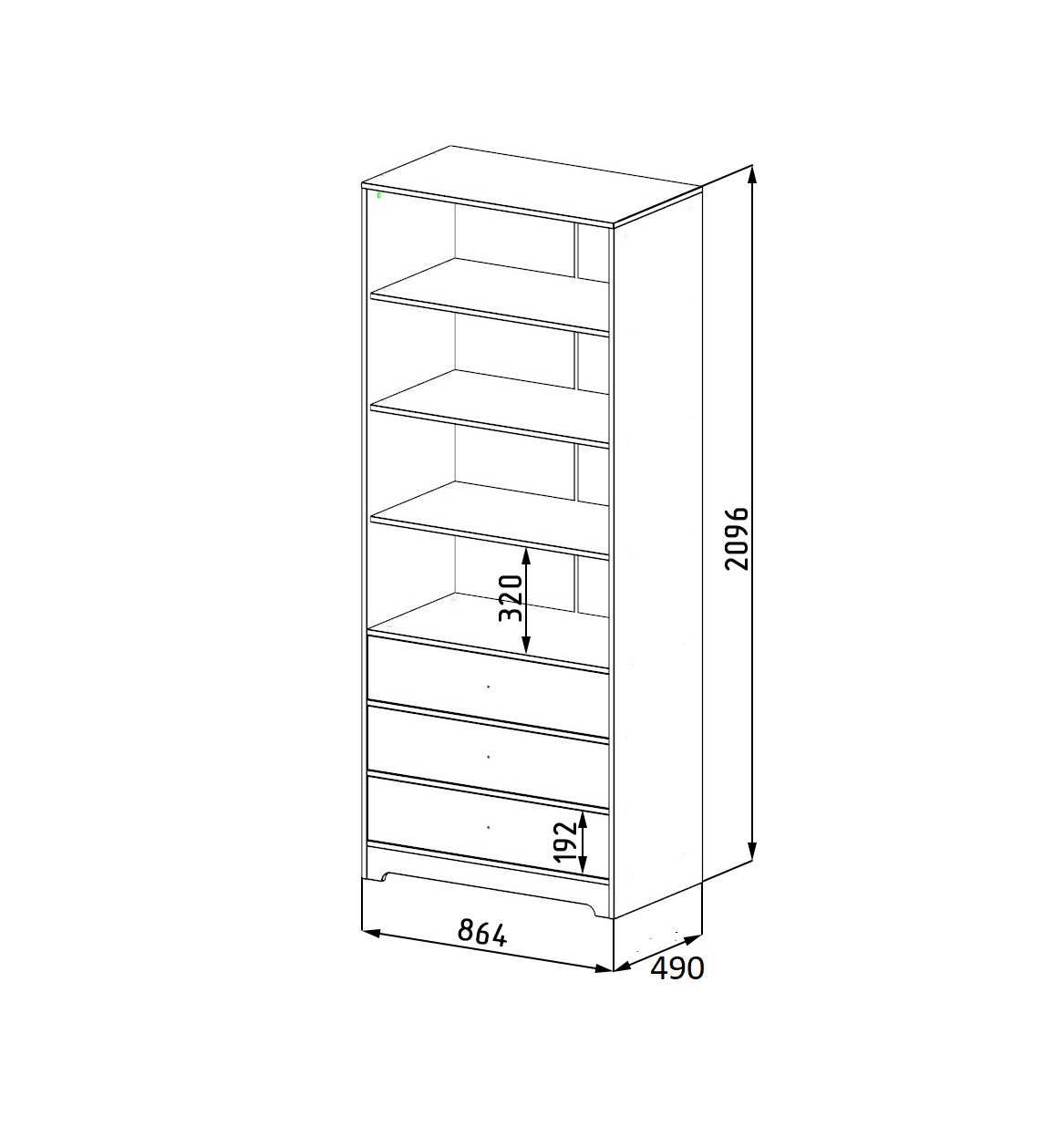 Габариты стеллажа: ширина 864, глубина 490, высота 2096 мм