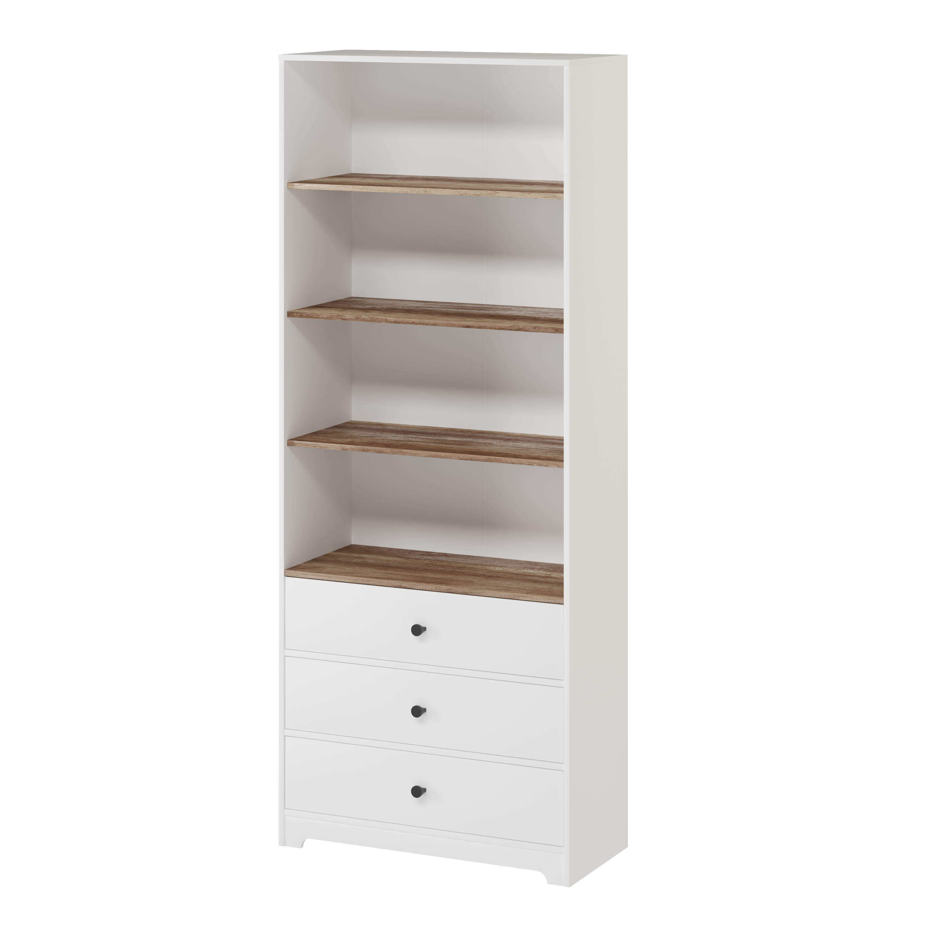 В стеллаж встроены три выдвижных ящика на направляющих скрытого монтажа с ДОВОДЧИКАМИ.
