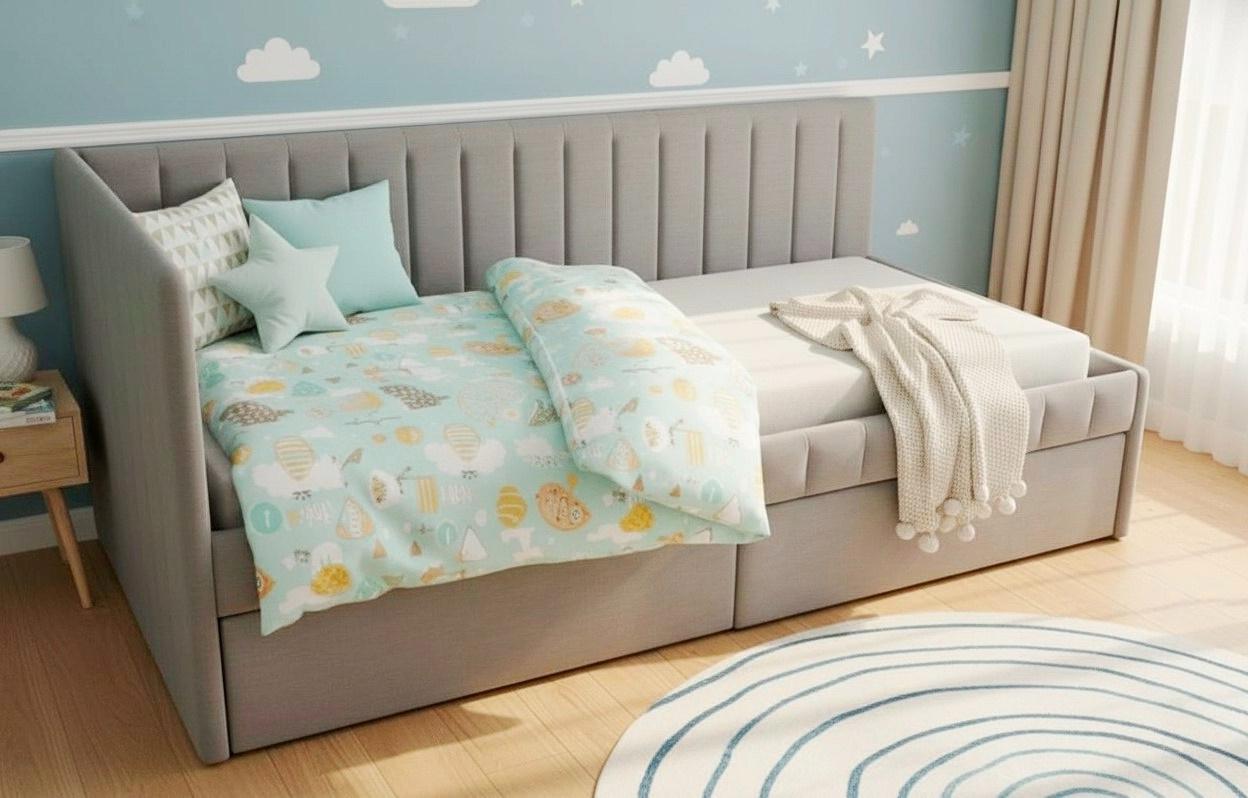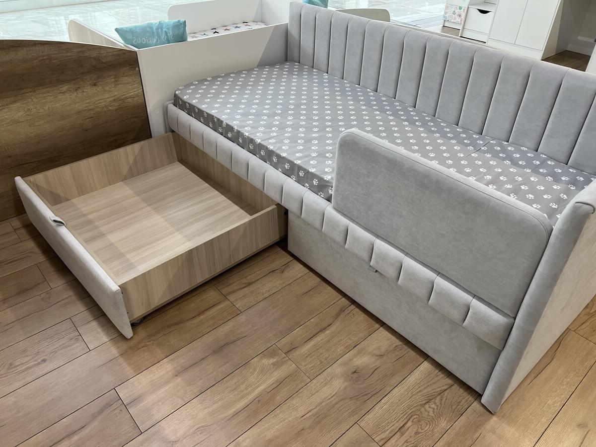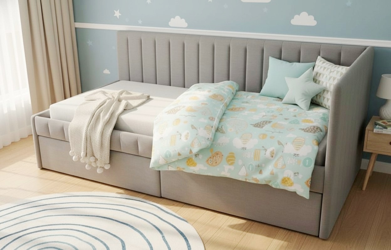 Кровать разработана с учетом требований к безопасности ребенка, сглаженные, мягкие углы, прочная конструкция и безопасные, гипоаллергенные материалы.