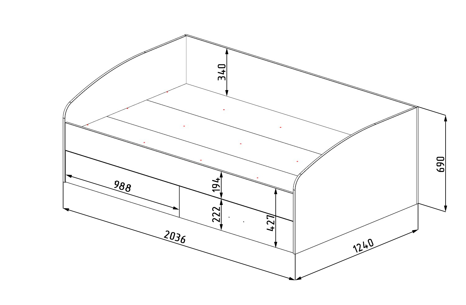 ширина 2036 х высота 690 х глубина 1240 мм