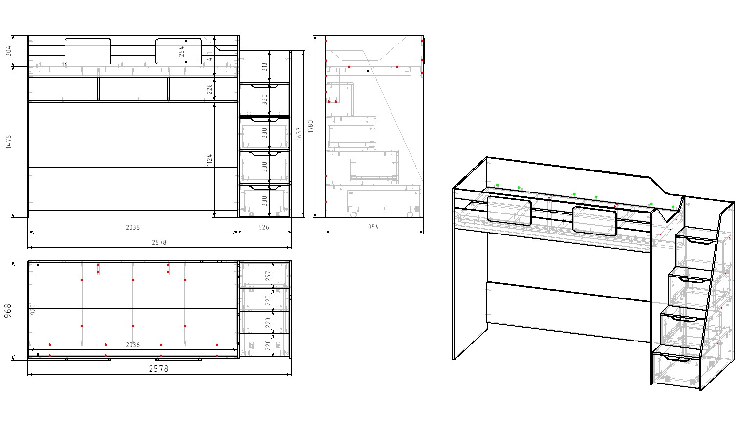 ширина с учетом лестницы 2578, глубина 968, высота 1780 мм.