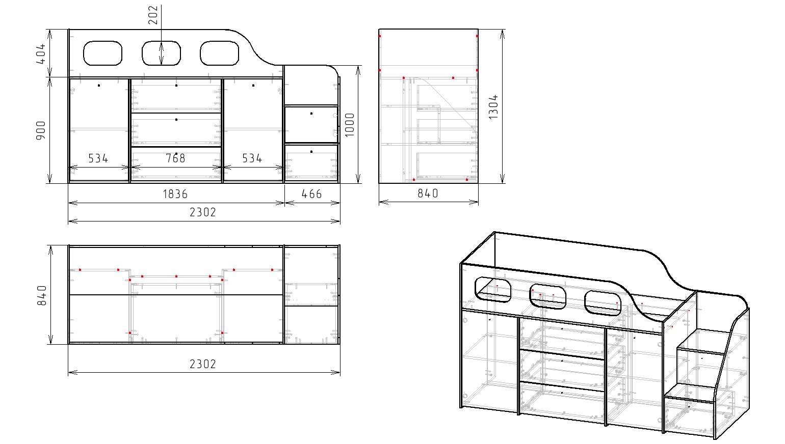 Габариты кровати: ширина 2302, глубина 840, высота 1304