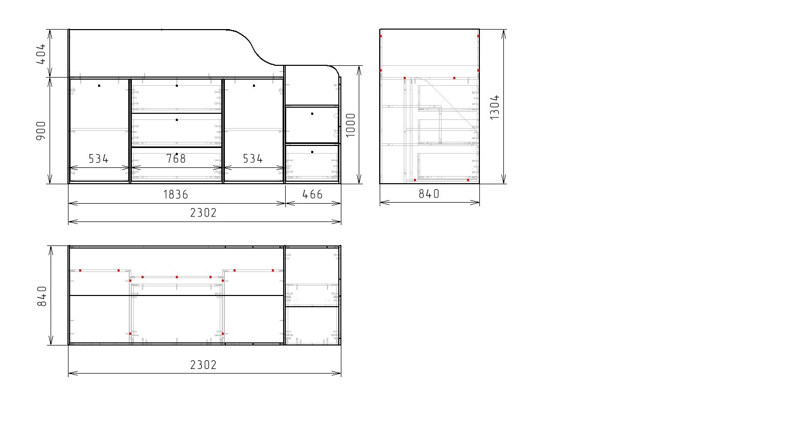 Габариты кровати: ширина 2302, глубина 840, высота 1304 мм