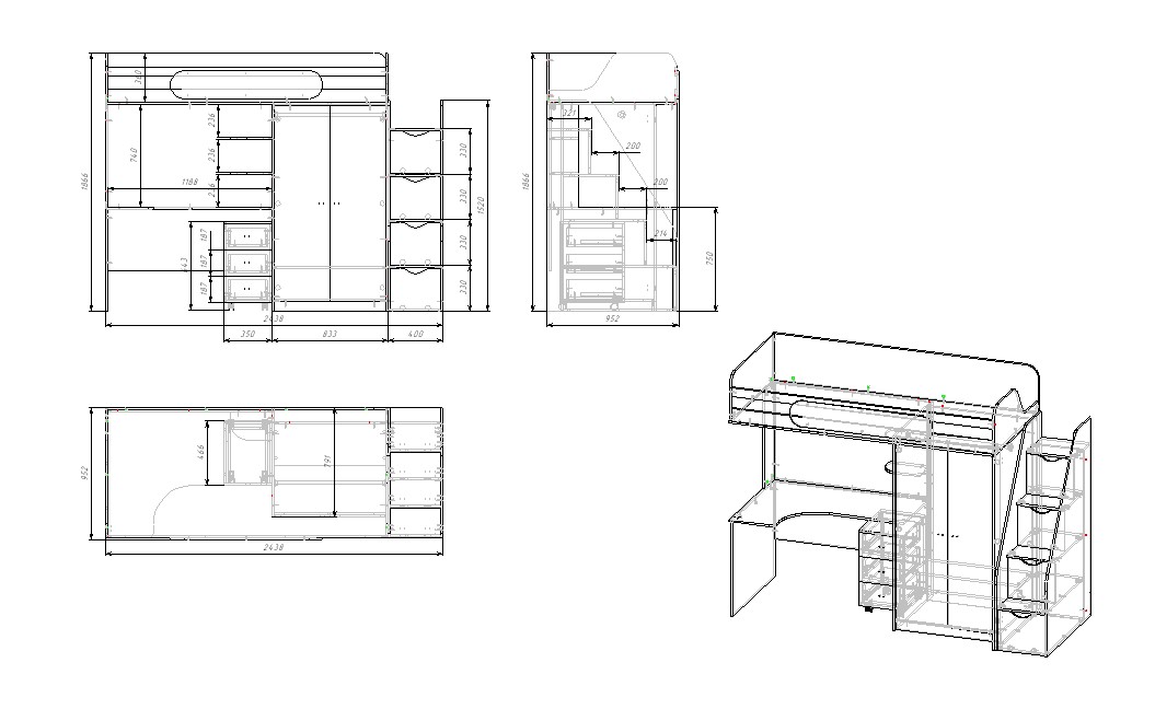 Габариты кровати: глубина 952 х высота 1866 х ширина 2438 мм