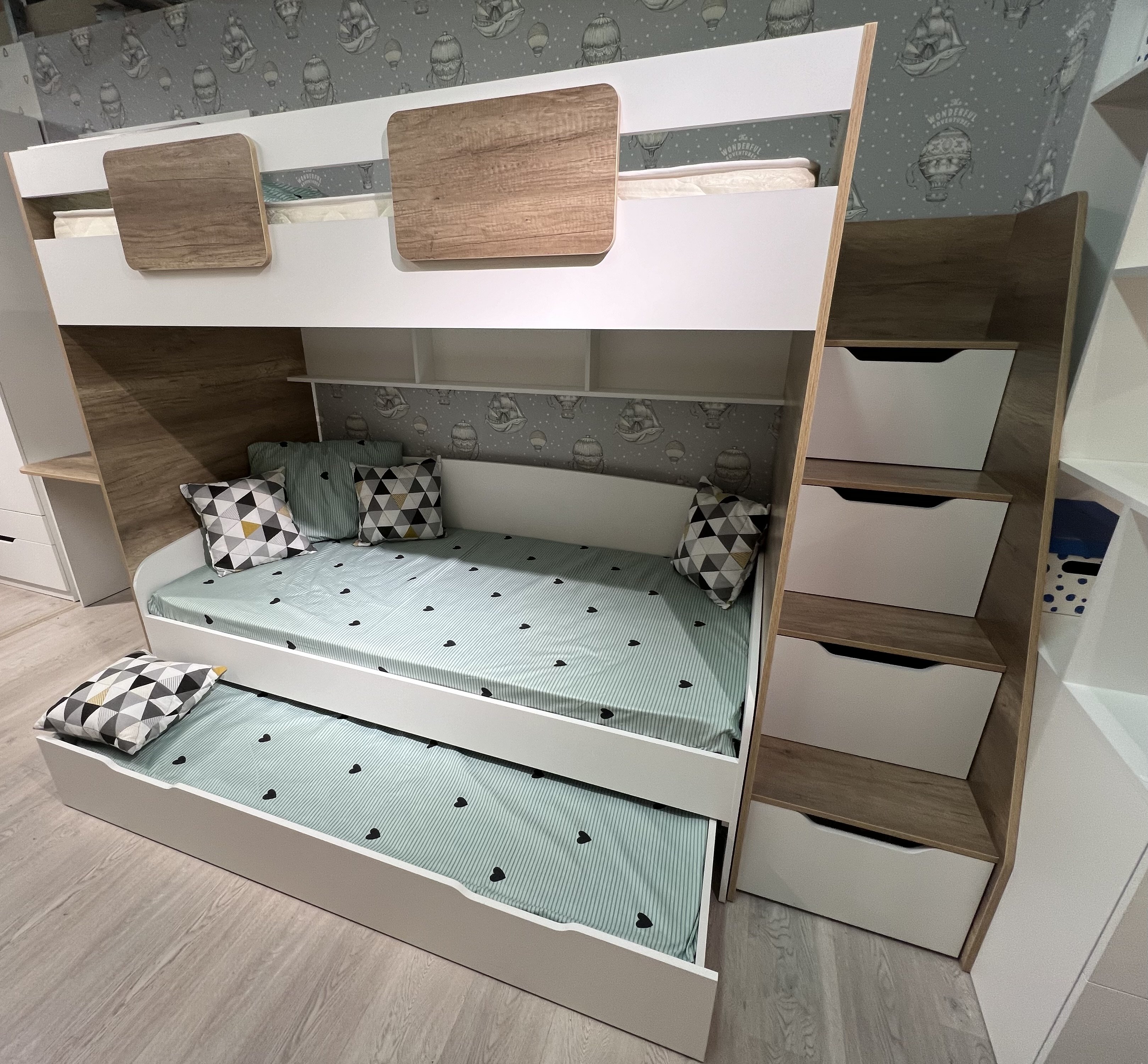 В лестницу встроены выдвижные ящики для игрушек - удобно и практично.
