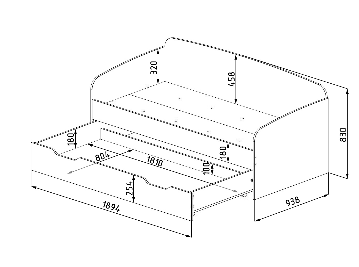 Спальное место низ (выкатное): 180 х 80 см - нагрузка на спальное место до 80 кг