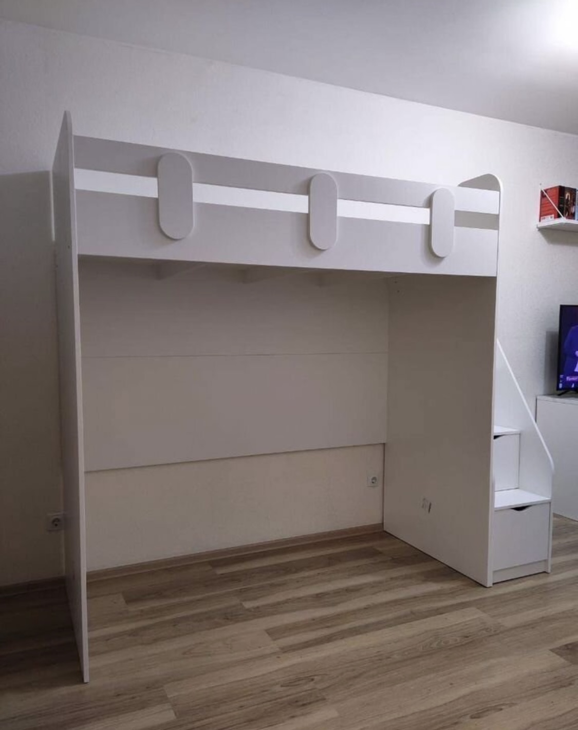 В лестницу встроены выдвижные ящики для игрушек - удобно и практично.