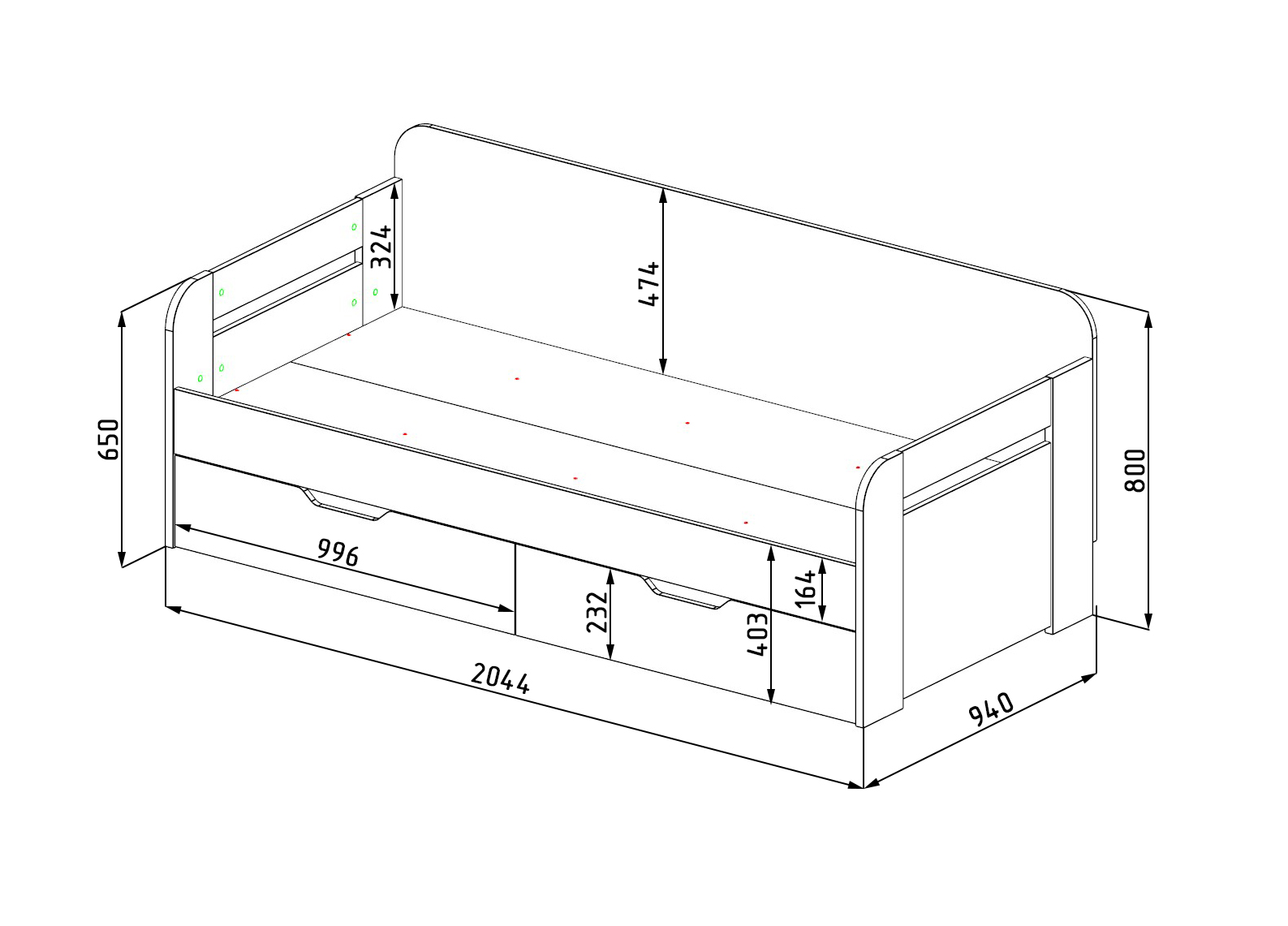 Габариты кровати: ширина 2044 х высота 800 х глубина 940 мм