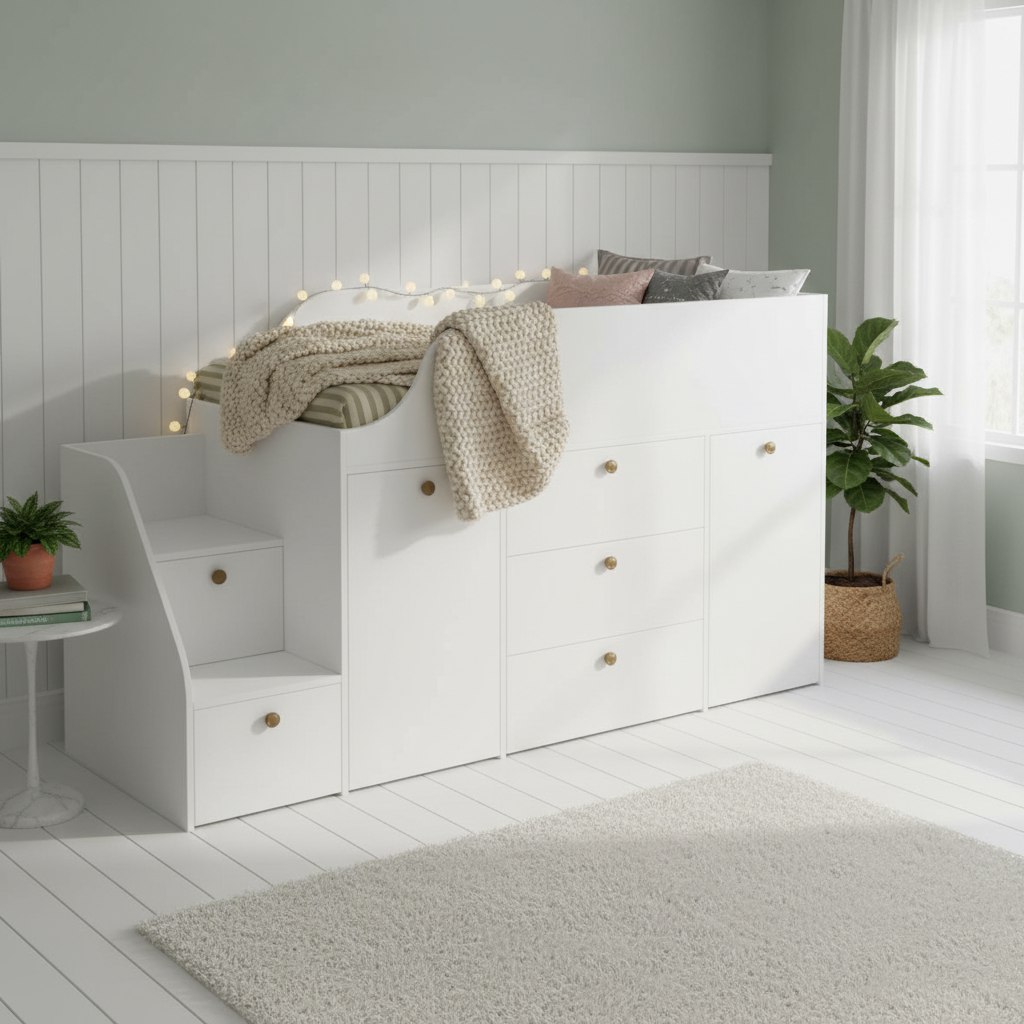 Функциональная кровать с удобной лестницей и множеством мест для хранения детских вещей.