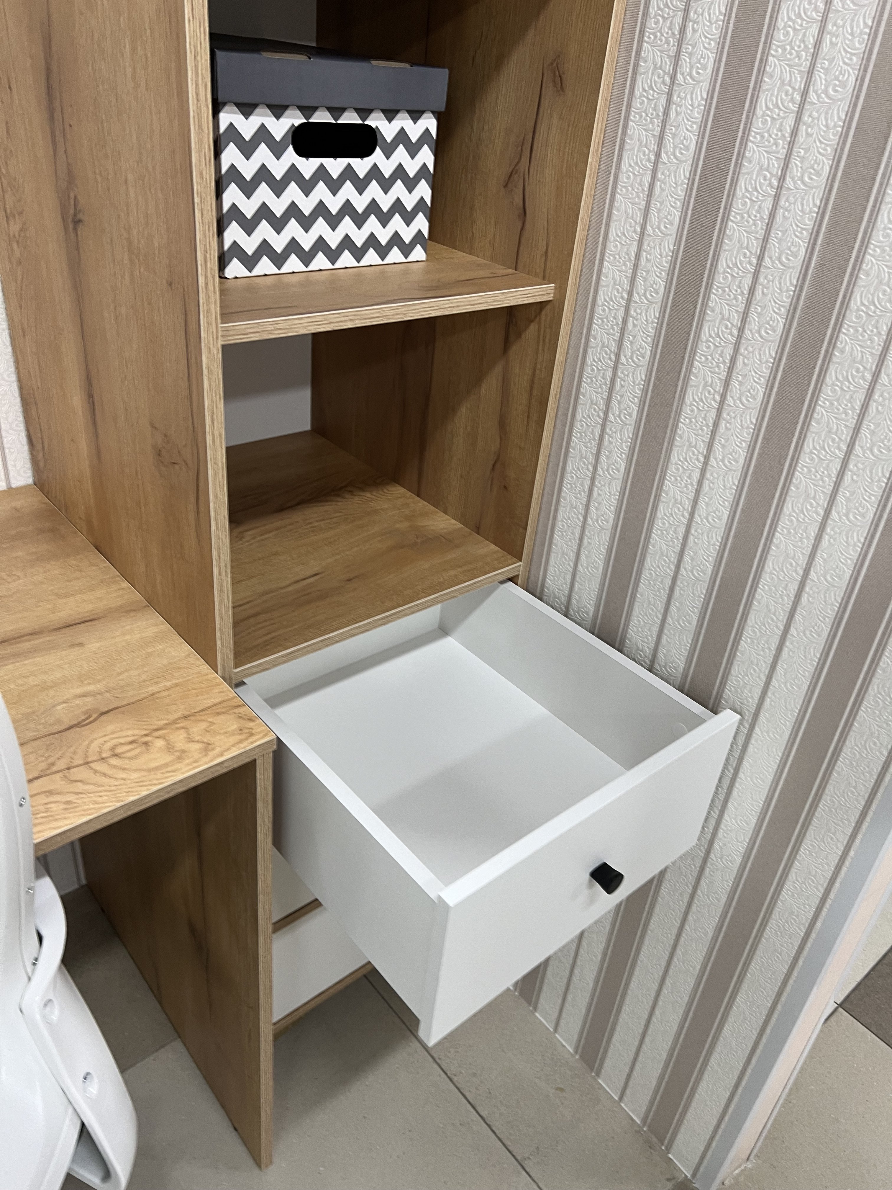 В пенал встроены три выдвижных ящика на направляющих скрытого монтажа с доводчиками.
