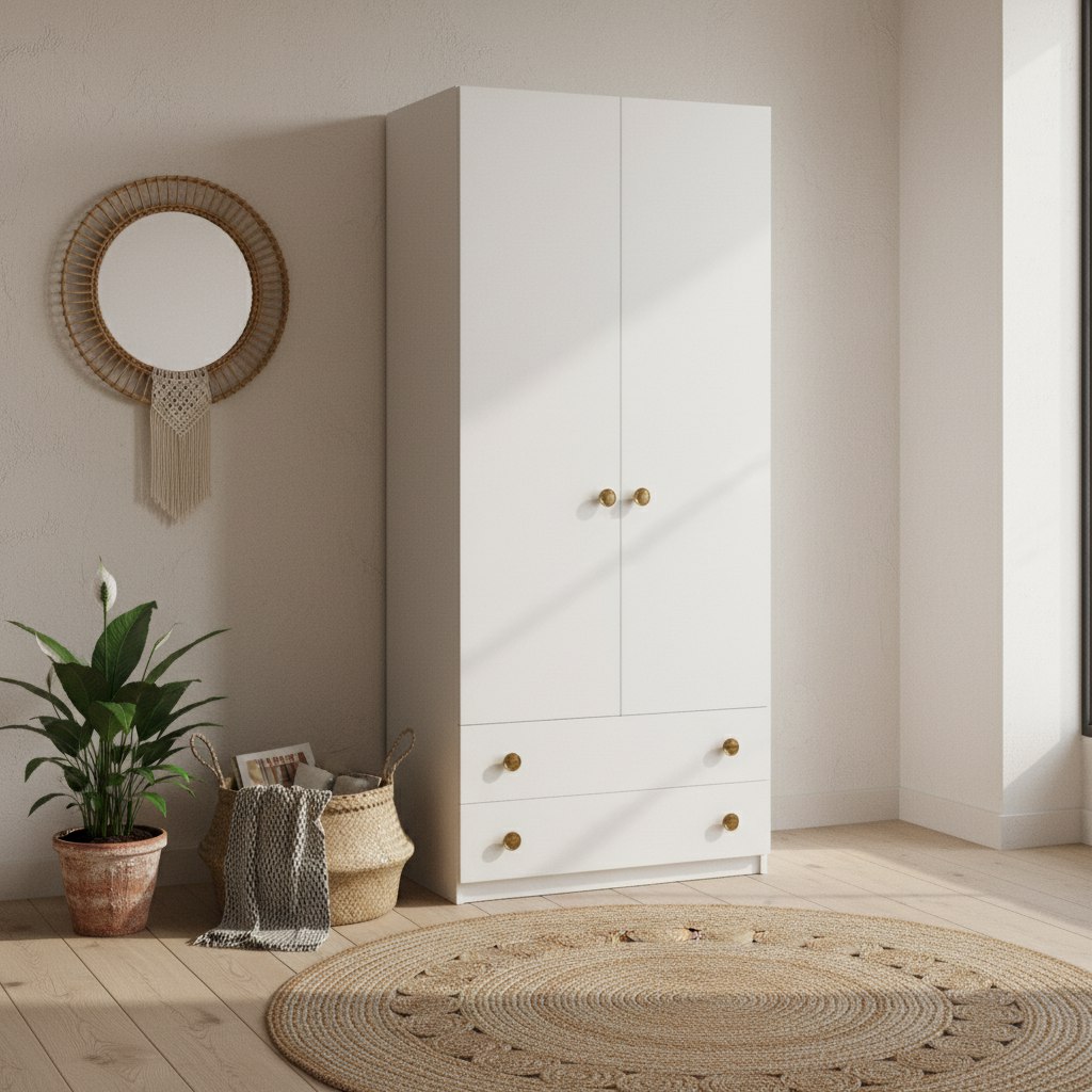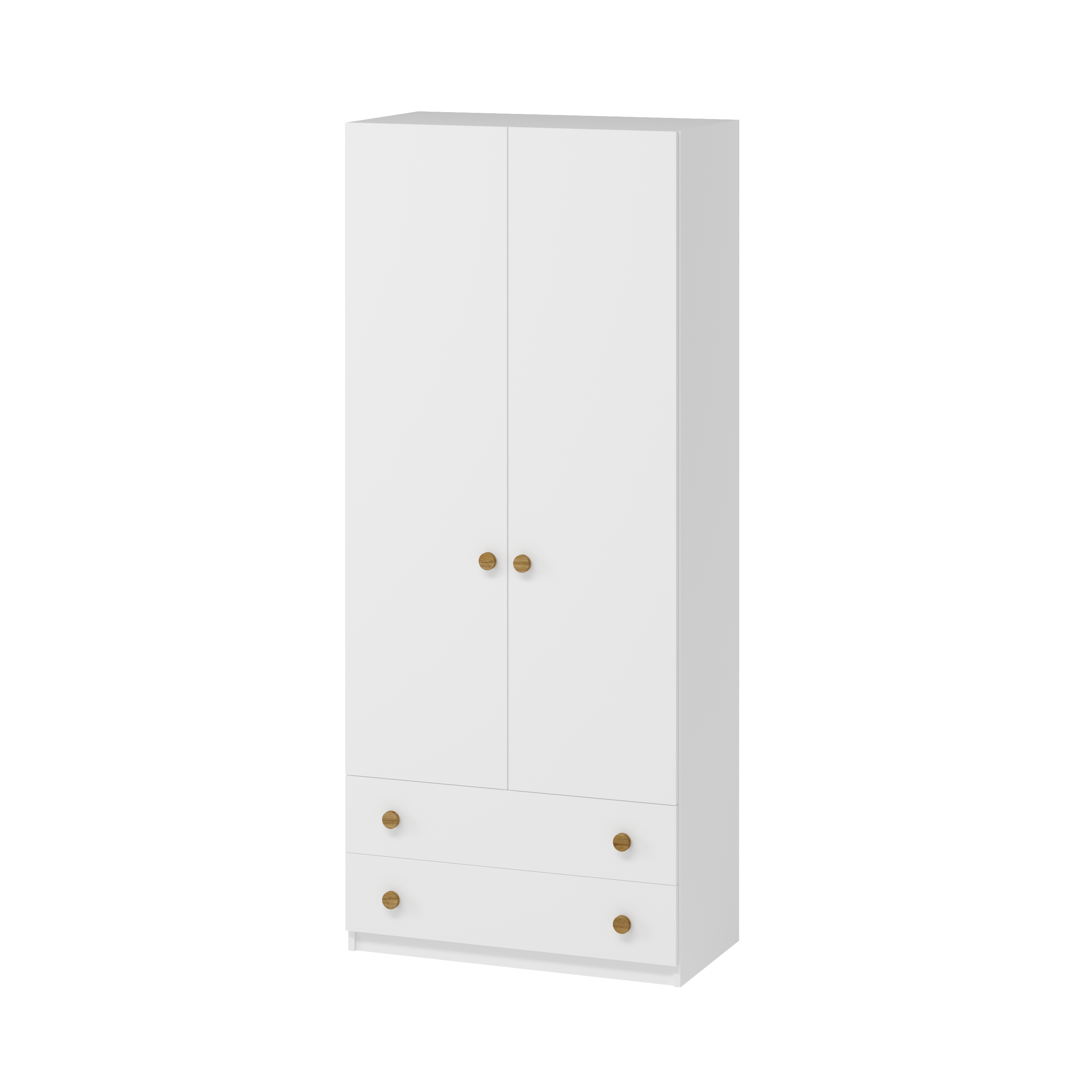 Шкаф оборудован двумя распашными дверями, двумя выдвижными ящиками для хранения мелких вещей.