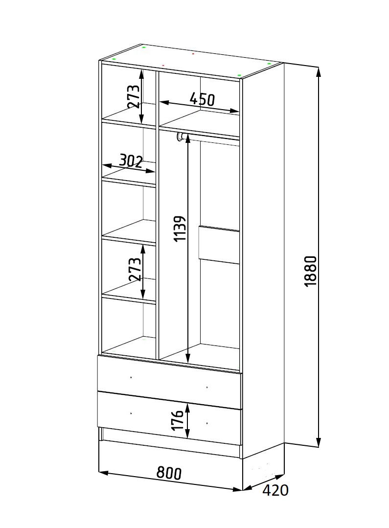Габариты шкафа: высота 2251 х ширина 800 х глубина 420 мм