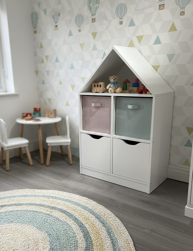 Стеллаж в виде домика - оригинальное и практичное дополнение в интерьере детской комнаты.
